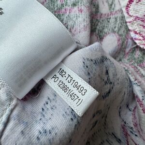 Tropical leaf/floral design in muted burgundy, sage green, and blue