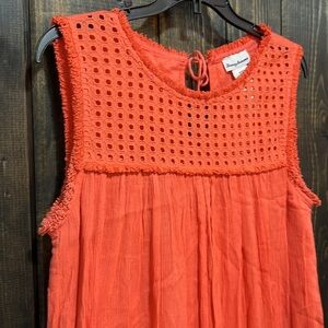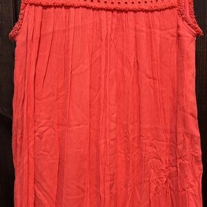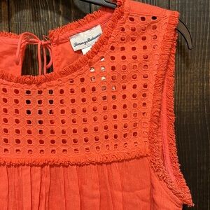 Tommy Bahama brand eyelet mini dress. Size medium. Coral pink. Fringe details. Sleeveless. Resort / Beach wear. Tie back with tassels. Boho Chic. Great for Spring & Summer. Vacation dress. Gauzy material. Fully lined. Preloved. Please see all photos for condition.