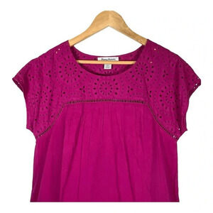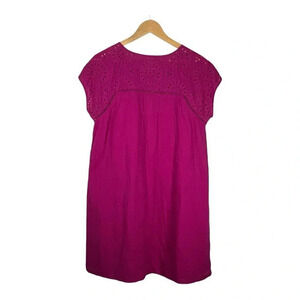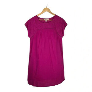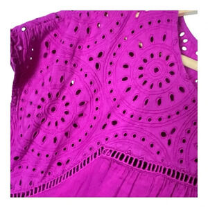 Tommy Bahama Fiesta Lights Fuchsia Pink Sundress, lightweight, floaty cotton, short sleeves, breezy, subtle crinkle texture, pretty eyelet embroidery, lined, women size small.