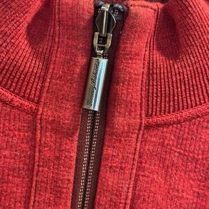 Measurements in photos. Experience the perfect blend of style and comfort with this Tommy Bahama red zip-up sweater. Featuring a high stand-up collar and a soft knitted texture, this sweater is designed to keep you warm and cozy. The deep red hue and adjustable zipper add a touch of elegance to your wardrobe.