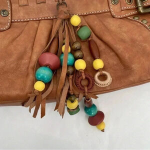 Beautiful genuine leather tan "Aruba" flex clutch/shoulder purse with wood beads & leather tassel accent
