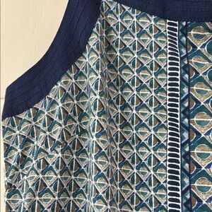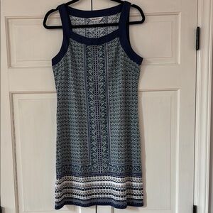 This casual sundress features a sleeveless design and a flattering neckline, perfect for warm weather. The dress showcases a geometric pattern in shades of blue and green and taupe against a white background, complemented by a navy blue border at the hem. Its lightweight fabric and simple silhouette make it an ideal choice for relaxed outings. Soft and comfortable cotton modal blend. Preowned with no flaws.