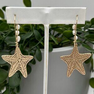 Elegant gold starfish earrings. Features pearl accents. Perfect for a beach-inspired look.