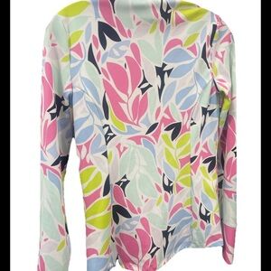 Bright leaf print top with a mix of pink, green, blue, and black. Ideal for a vibrant style. Golf long sleeves excellent condition XS