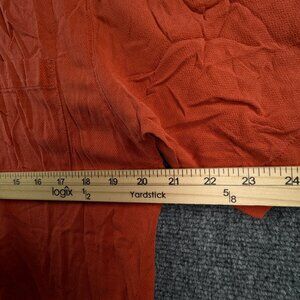 Good condition but has some small flaws - a few fabric pulls and a few small stain on the back of one sleeve. Note that the color in person is slightly more red than the photos show. The shirt is still orange, but more of a reddish orange in person. See photos. Message for any questions, we reply quickly!