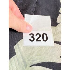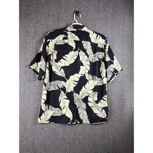 Elevate your style with this Tommy Bahama Hawaiian button-up shirt. Crafted from 100% silk, this shirt features a spread collared neckline, short sleeves, and a regular fit. The black palm leaf pattern adds a touch of the tropics to your wardrobe, making it perfect for travel, parties, or casual wear. This shirt is machine washable and is a part of the resort product line from Tommy Bahama. It comes in size L and is perfect for men who want to add a touch of Hawaiian vibe to their wardrobe. The shirt is made in the Bahamas and is an authentic Tommy Bahama product.