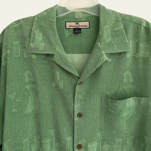 Tommy Bahama Hawaiian Camp Shirt Green M Silk Hula Dancer Bahama Colada EUC