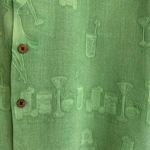 Vacation, Hawaiian, Delicate, Hawaiian Shirt, Embossed, Hula Dancer, Cocktails, Bahama, Bahama Colada, Coconuts, Lemons, Swizzler Sticks, Palm Tree, Green Shirt, Silk, Camp Shirt, Tommy Bahama, Retro, Leisure, Relax