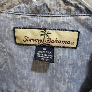 Tommy Bahama Hawaiian Floral Palm Tree Blue Button Shirt Silk Luau Camp Size XL.