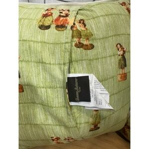 This listing features charming Tommy Bahama decorative throw pillows. Adorned with cute Hawaiian hula dancers, these green patterned pillows bring a vibrant tropical touch. Perfect for adding a fun, island-inspired accent to any living space or bedroom.