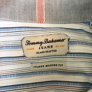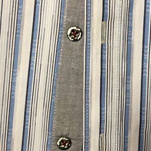 Men's Tommy Bahama shirt. Shades of blue vertical stripe long sleeve shirt. Gray contrasting placket. Silver buttons were painted white but it is chipping off. Shirt great pre-owned condition except for the buttons. If you are looking for a more distressed look maybe you will like this shirt. Please see phots. Red thread attaches the buttons.