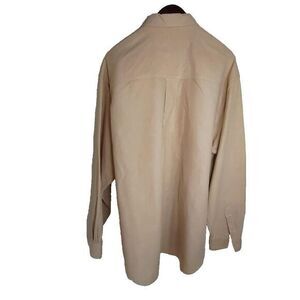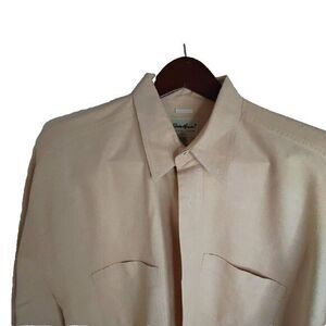 Travel Business Casual Everyday Work Church Vintage---This Eddie Bauer button-down shirt for men is a classic wardrobe essential. Made of 100% cotton, it features a solid beige pattern with a collared neckline and button closure. The shirt has long sleeves and a regular fit, making it suitable for both casual and formal occasions. It also includes two pockets for added convenience. The shirt is machine washable and has a chest size of 55 inches, corresponding to an XL size. It is suitable for all seasons and is perfect for men who prefer a button-down collar style. Made in Taiwan, this shirt is a high-quality garment that is perfect for any man's wardrobe.