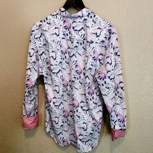 Tommy Bahama Island Zone Pink and Blue Leaf Print Button Down Shirt Pima Blend S