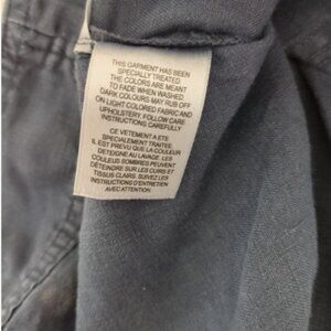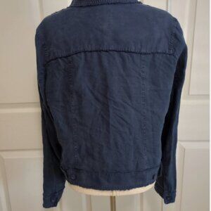 The Tommy Bahama women's jacket in size L, is stylish and lightweight. Made of breathable linen fabric, this navy blue jacket features a button closure and a raw-edge design with two front pockets. Easy to care for with machine-washable instructions. This Tommy Bahama jacket is a classic and versatile addition to any woman's wardrobe. 23" pit to pit, and 22" from the shoulder to the bottom hem. NWOT