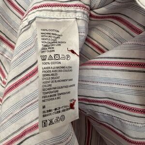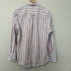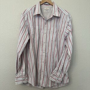 This Tommy Bahama button-down shirt is perfect for any casual occasion. The white and red striped pattern gives it a fun and beachy vibe, while the cotton material makes it comfortable and breathable. With long sleeves and a collared neckline, it's suitable for all seasons and can be easily machine washed for your convenience.