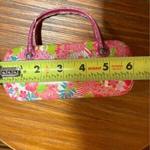 The case is primarily white with pink, green, and blue floral patterns, featuring the Tommy Bahama Kids logo. It has a glittery pink handle and a snap closure. It is designed to be both functional and stylish for children. Good condition. Thanks for looking!