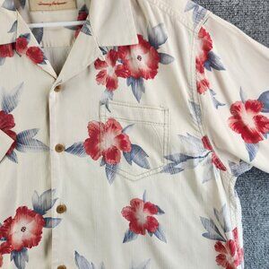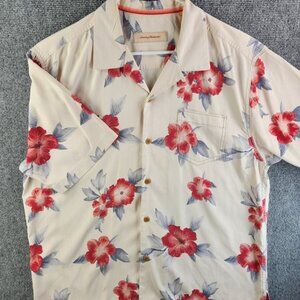 Tommy Bahama Large 100% Silk Beige Floral Short Sleeve Button Up Shirt Hawaiian