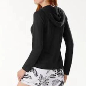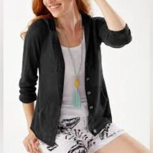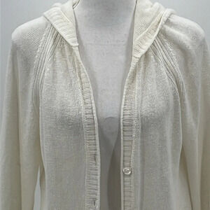 Tommy Bahama Lea Linen Hooded Button Front Cardigan in Off White - Size Medium. Great pre-owned condition. Only issue is one extremely faint spot on the front button placket. You can barely make it out in the picture. I'm thinking it's just a surface dirt spot. Oh and it does have a perfume smell to it. Model pics are included to show fit only. Please refer to actual product photos for color. It's an off white, very light cream color. 100% linen, very lightweight and breathable, button front, 2 pockets, hooded, rolled edges. Approximate measurements: 19" pit to pit, 25" length.
