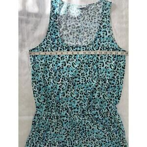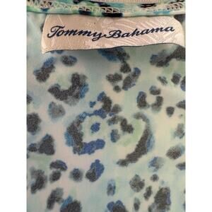 The Tommy Bahama Leopard Print Drawstring Tank Dress Swim Cover Up in women's size M is a stylish and versatile piece perfect for the beach or pool. This cover-up features a wide tank style with a solid aqua and black leopard print, made from a lightweight and breathable blend of nylon and Lycra spandex. It is designed with adjustable drawstrings and a belted waist for a comfortable fit, making it easy to throw on for a day of outdoor activities or lounging by the water. Perfect for those who love a touch of nature and animal print in their wardrobe, this Tommy Bahama cover-up adds a fun and tropical touch to any swimsuit.