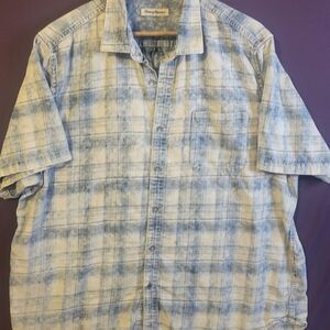 Casual light blue checkered button up short sleeved shirt by Tommy Bahama. Soft cotton. Distressed for softness. Ideal for relaxed outings.