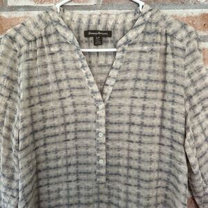 Women's size small Tommy Bahama lightweight shirt. 1/4 button neckline, sleeves can be worn down or rolled up. Gray and beige pattern. 100% cotton material, excellent condition!