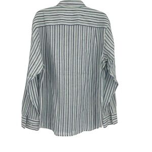 Tommy Bahama Linen Blend Striped Mens Long Sleeve Button flip cuff Shirt Size Medium. One breast pocket. Cuffed sleeves. Point collar with under-button. Chest 44. Length 29. Measurements are approximate. Shirttail hem. White and shades of blue stripes. Linen/Sorona polyester blend. Very good preowned condition.