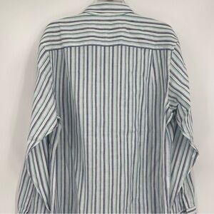 Tommy Bahama Linen Blend Striped Mens Long Sleeve Button flip cuff Shirt Size Medium. One breast pocket. Cuffed sleeves. Point collar with under-button. Chest 44. Length 29. Measurements are approximate. Shirttail hem. White and shades of blue stripes. Linen/Sorona polyester blend. Very good preowned condition.