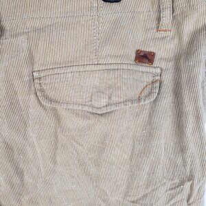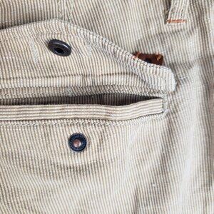 Five pocket flat front shorts with zipper fly and button closure. Two tone khaki tan stripe with amber stitching. Slanted front pockets with one coin pocket; one back welt pocket still sewn shut and one snap flap pocket.