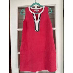 A vibrant splash of color awaits with this Tommy Bahama linen dress. The dress features a classic shift silhouette, perfect for warm weather. The sleeveless design and breathable linen fabric ensure comfort, while the unique white and navy trim around the V-neck adds a touch of nautical charm. Side pockets offer practicality without compromising the dress's sleek lines. MSRP 125$