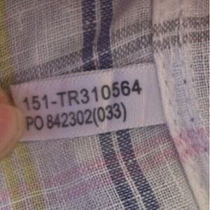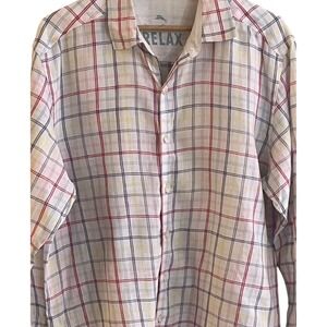 This is a preowned linen Relax Fit Tommy Bahama long sleeve button down shirt in rainbow stripes. It is in good condition. It is missing the top button that closes the collar and the second button on both sleeves. There are no extra buttons but should be easy to replace.