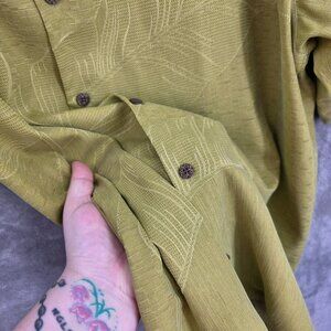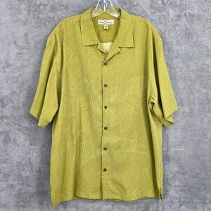 Tommy Bahama Loop Collar Silk Shirt L Yellow Green Tropical Textured Leaf Print