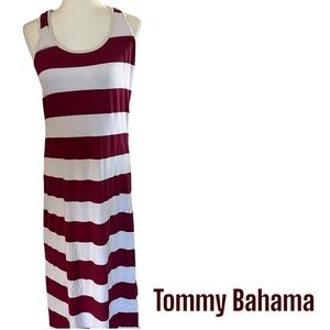 Chic Tommy Bahama maxi dress with razor back with bold maroon and white stripes. Ideal for casual wear a day at the beach