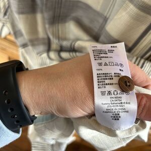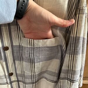 Features: Very nice button front shirt. Collared. Plaid print all over. Short sleeves. Pocket at the front of the chest.