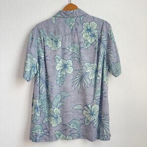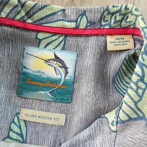 Tommy Bahama Men 100% Silk Shirt Medium Gray Blue Floral Marlin Print Hawaiian