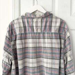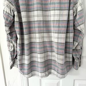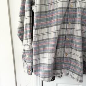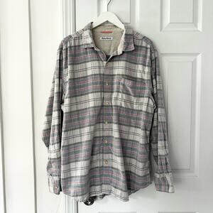 Size XL from Tommy Bahama. Style name Becket Bay. Style number T320448. Continental plaid of grey white blue and red. Sunwashed corduroy finished casual button down shirt. Front open chest patch pocket. Preowned in good condition with no stains or tears.
