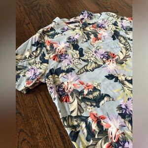 Details: 100% silk. Tommy Bahama Men’s XL Tropical Floral design. Jacquard texture. Functional front upper left chest pocket. Extra buttons included on inside care tag.
