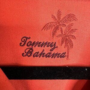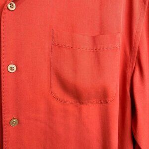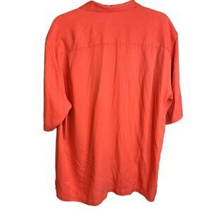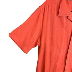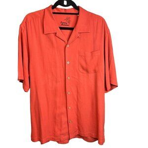 Tommy Bahama Men's Hawaiian Button Down Short Sleeve Shirt is a Size Large, coral-colored, and made from pure silk. It's a comfortable and stylish piece, perfect for summer.