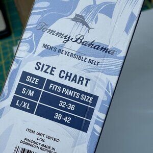 Versatile men's reversible belt by Tommy Bahama in blue/brown. Features comfort-stretch design, durable buckle, and L/XL fit for pant sizes 38-42.