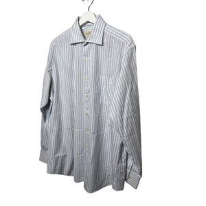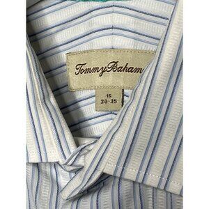 A Tommy Bahama Men's Shirt in size Large. Features a white and blue striped pattern, crafted from pure cotton. Button-up design with long sleeves.