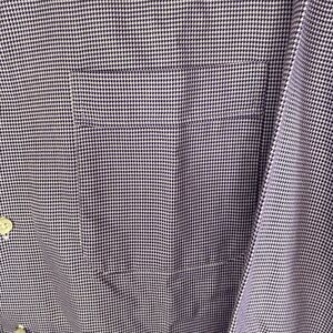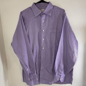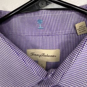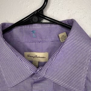 This is a Tommy Bahama men's shirt with a long sleeve in a purple check pattern. It is a regular fit button-up shirt made of cotton, originating from the Bahamas. The shirt has a collared neckline and button closure, with a size of 17. It is a stylish and casual option for men's clothing.