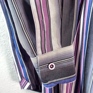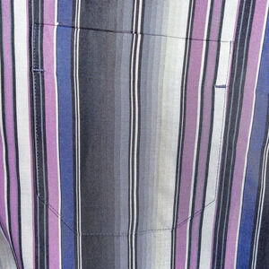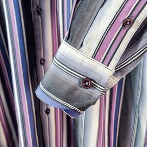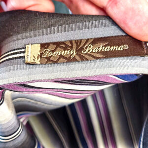 Tommy Bahama men’s silk button-up shirt in a rich blue, lilac, and gray stripe pattern. Men’s size small. The smooth silk drape and sheen bring out that yacht club energy — equal parts relaxed and refined. It captures the nauticalluxe mood of coastal classics, where comfort meets polish and every detail feels intentional.