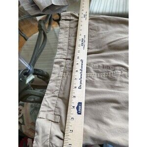 Elevate your casual beach style with these Tommy Bahama shorts in a solid beige color. Made from a blend of polyester, nylon, and spandex, these chino shorts offer a comfortable stretch fit with a flat front and zip closure. The 9-inch inseam and slash pockets make them perfect for a day at the beach or travel. Accented with the Tommy Bahama logo, these shorts are a regular fit for men size 42. There are some stitching coming off the left leg as shown in the picture