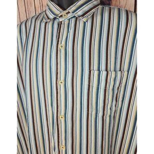 This luxurious Tommy Bahama shirt offers an exceptional combination of comfort and style. Crafted from 100% silk, this button-down shirt provides a lightweight and smooth feel on the skin. The striking blue and brown stripes make it a versatile choice for both casual and formal settings, enhancing any wardrobe effortlessly.