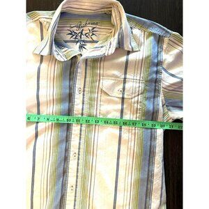 Tags-Tommy Bahama, striped shirt, silk blend shirt, men's button-up, casual shirt, long sleeve shirt, breathable fabric, medium size shirt, semi-formal shirt, multicolor shirt, lightweight fabric, chest pocket shirt, designer men's shirt