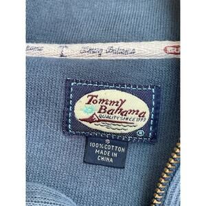 Men's size small Tommy Bahama sweater in a medium blue. It is a long-sleeve pullover style with 1/4 front zip. Made from 100% Cotton.
