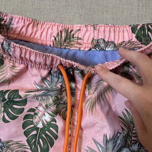 Color: Pink with tropical floral & leaf print, orange drawstring