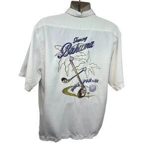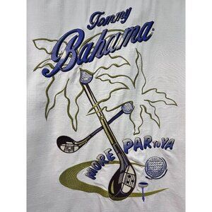 Tommy Bahama Mens Vintage White Embroidered Button Up Camp Shirt Large Pocket Coconut Buttons Golfing Novelty Funny More Par To Ya Lightweight Breathable. Great Pre-Owned Condition Gently Worn. Ships from smoke free home.