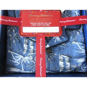 Tommy Bahama Men's Woven Notch Collar Long Pant PJ set Tropical Island Life NIB. Tommy Bahama Men's "Woven Notch Collar" long pant 2 piece pajama set. Brand New with all original tags and packaging in size large, (L) this set is made of 100% soft cotton. Button front and blue in color with white accents and a classic Tommy Bahama Island Life tropical themed print. Gift box included as pictured. This set is perfect for wearing all year round. Fast U.S. shipping. Classic Tommy Bahama style for a great price. ($124.00) Please message us with any questions and visit our store for more great stuff. Thanks!