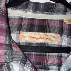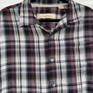 Luxury Tommy Bahama men's button-down shirt in size XL. Features premium 100% silk construction with sophisticated plaid pattern in purple, gray, black & white. Short sleeves, full button front closure, and classic collar. Perfect for resort wear, vacation, or elevated casual styling. Tommy Bahama's signature island-inspired luxury at its finest. Excellent condition with no visible flaws.