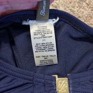 This swimsuit is made by Tommy Bahama. It’s a navy blue halter style with a ruched body, underwire cup and a cute back. Size 6 with a C cup and in great pre owned condition. Smoke and pet free home.